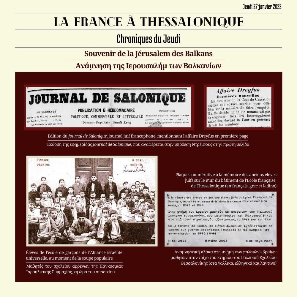 Την 27η Ιανουαρίου 2022, Διεθνή Ημέρα αφιερωμένη στην μνήμη των θυμάτων του Ολοκαυτώματος, θελήσαμε να αποτίσουμε φόρο τιμής στην εβραϊκή κοινότητα της Θεσσαλονίκης και στους στενούς δεσμούς που έχει δημιουργήσει με τη Γαλλία.