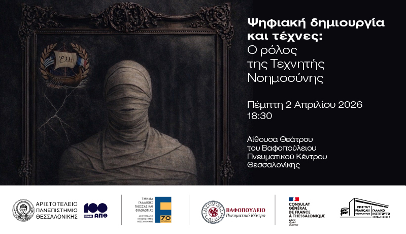 Επιστημονική εκδήλωση-στρογγυλή τράπεζα με τίτλο «Ψηφιακή Δημιουργία και Τέχνες: Ο Ρόλος της Τεχνητής Νοημοσύνης» διοργανώνει το Τμήμα Γαλλικής Γλώσσας και Φιλολογίας του Α.Π.Θ., με την υποστήριξη του Γαλλικού Ινστιτούτου Θεσσαλονίκης, του Γενικού Προξενείου της Γαλλίας και του Βαφοπούλειου Πνευματικού Κέντρου την Πέμπτη 2 Απριλίου 2026 και ώρα 18.30, στο Βαφοπούλειο Πνευματικό Κέντρο (Αίθουσα Θεάτρου).