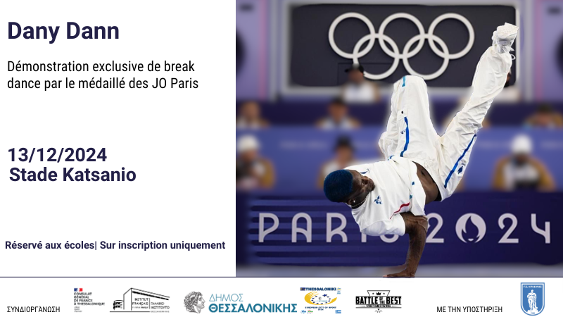 Les élèves des écoles de Thessalonique auront l’opportunité d’assister à une démonstration exceptionnelle des compétences et du talent de Dany Dann, médaillé d’argent en break dance aux Jeux Olympiques de Paris. Cet événement éducatif est organisé par l’Institut Français de Thessalonique, la municipalité de Thessalonique, le Département des sports, de la jeunesse et du bénévolat, ainsi que le Street Dance Festival Battle of the Best, avec le soutien du club GS Iraklis et sous l’égide du Consulat général de France à Thessalonique.