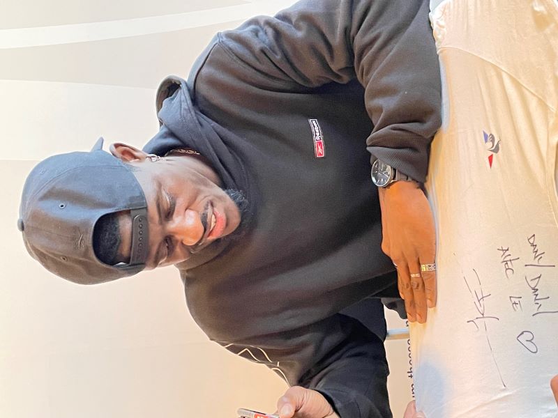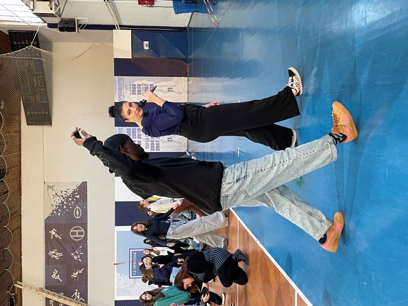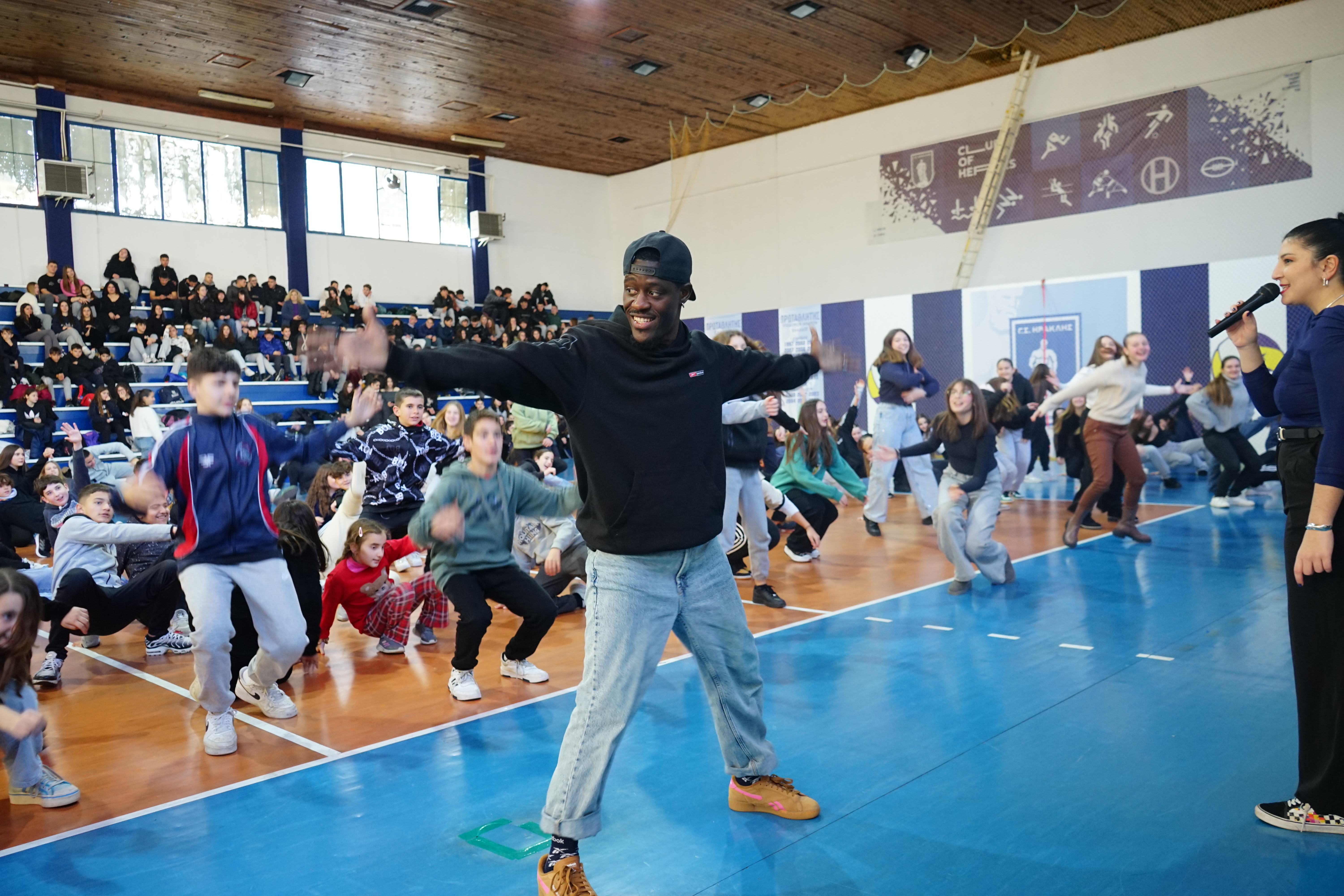Par la suite, les élèves l’ont rejoint sur le terrain pour un atelier de breakdance, où il leur a patiemment montré des mouvements spécifiques, terminant par une petite chorégraphie réalisée tous ensemble.