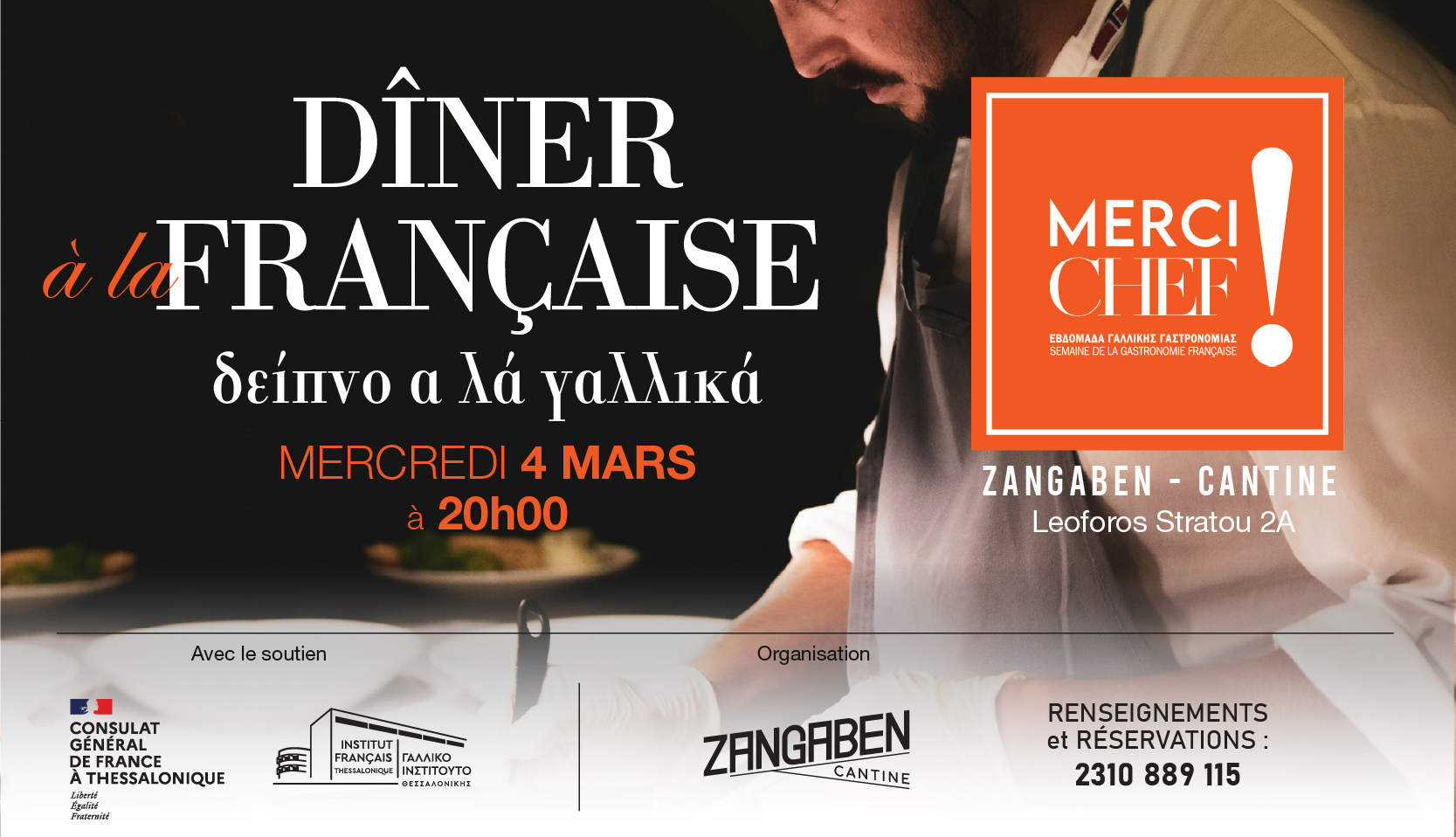 Le Consulat Général de France et l’Institut Français de Thessalonique vous invitent à un dîner à la française, organisé dans le cadre de la semaine de la gastronomie française « Merci Chef « organisée pour la troisième année consécutive par l’ambassade de France en Grèce, du 1er au 6 mars 2026.