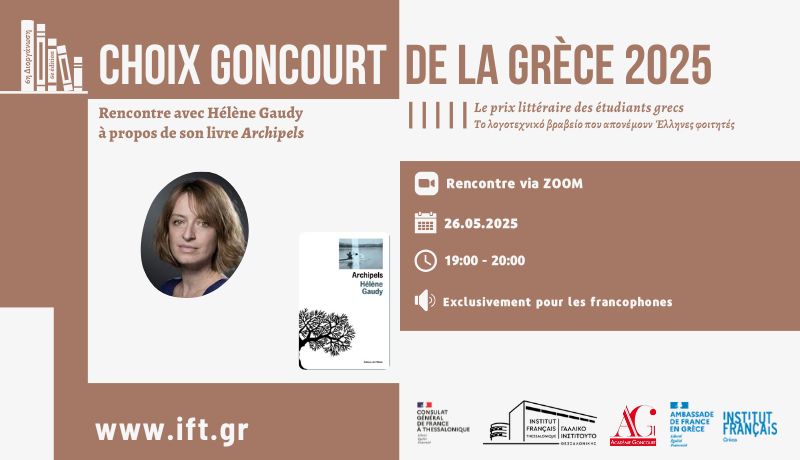 Dans le cadre de la sixième édition du Choix Goncourt de la Grèce, des étudiants et des professeurs grecs rencontreront l’écrivaine Hélène Gaudy pour son livre Archipels, le lundi 26 mai 2025 à 19h00.