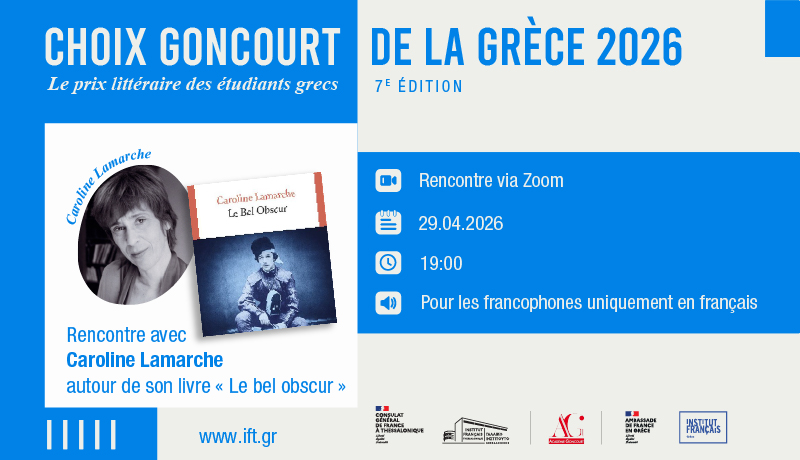 Des étudiants et des professeurs grecs rencontreront l’écrivaine Caroline Lamarche pour discuter de son livre Le bel obscur le mercredi 29 avril 2026 à 19h00 par vidéoconférence, dans le cadre de la septième édition du Choix Goncourt de la Grèce.