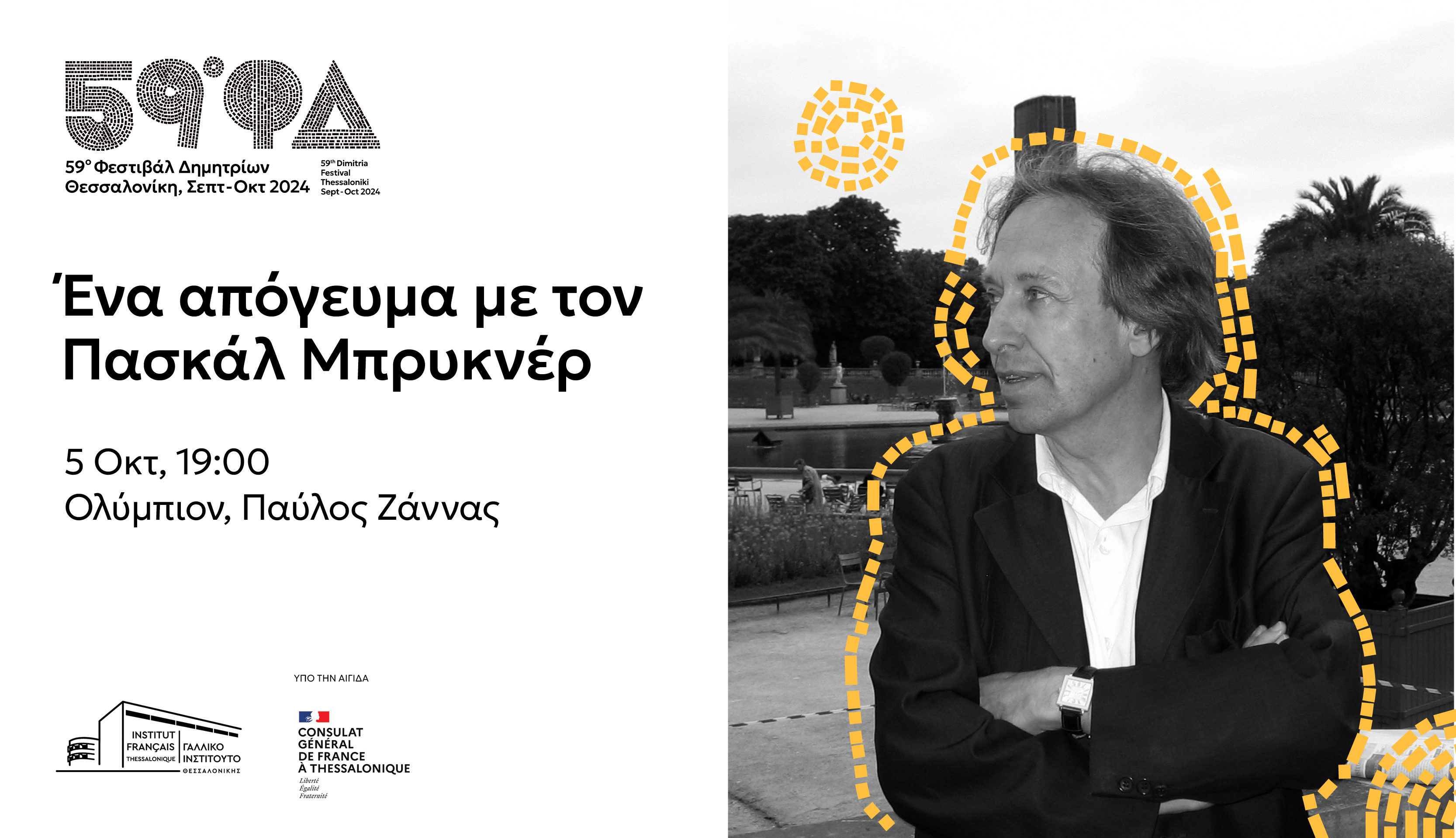 Yannis Kotsifos, journaliste et directeur de l’Union des journalistes de Macédoine-Thrace, ainsi que Vasso Kouidou, journaliste et responsable du service de presse et de communication de l’Institut français de Thessalonique, s’entretiendront avec Pascal Bruckner lors de cet événement, organisé en collaboration avec l’Institut français de Thessalonique et la 59e édition du festival Dimitria. Il se tiendra sous l’égide du Consulat général de France à Thessalonique.