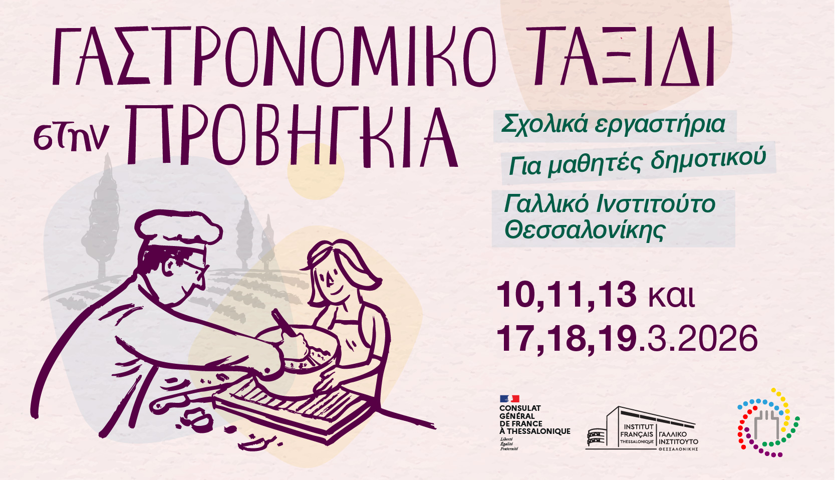 Στο πλαίσιο του Μήνα Γαλλοφωνίας, οι καθηγητές του Lycée Aristide Briand Orange, ο Λιονέλ Φρανσέ (Lionel Franchet) και o Γάλλος σεφ, Ζαν-Σεμπαστιάν Εντελμπλού (Jean-Sébastien Edelblout) με τους μαθητές τους, έρχονται από την Οράνζ στη Γαλλία στο Γαλλικό Ινστιτούτο Θεσσαλονίκης για να παρουσιάσουν σε Έλληνες μαθητές των δύο τελευταίων τάξεων του δημοτικού τη γαλλική γαστρονομία.