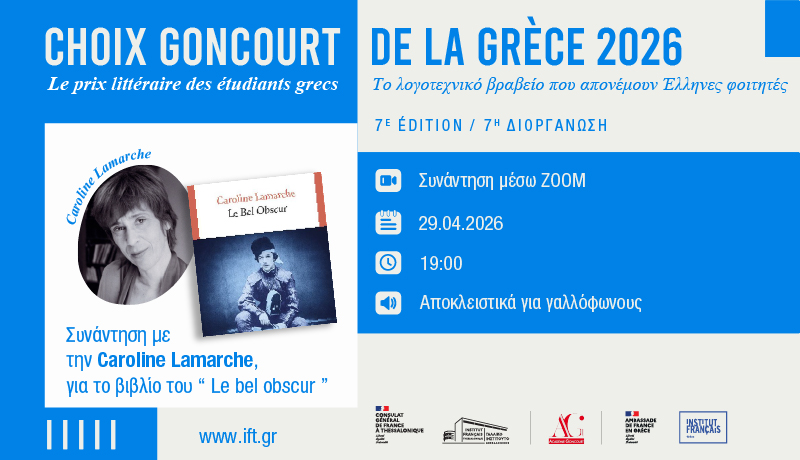 Συνάντηση και συζήτηση με τη συγγραφέα Καρολίν Λαμάρς (Caroline Lamarche) για το βιβλίο της Le bel obscur , θα έχουν Έλληνες φοιτητές και καθηγητές την Τετάρτη 29 Απριλίου 2026 στις 19:00 μέσω τηλεδιάσκεψης, στο πλαίσιο της έβδομης διοργάνωσης του Βραβείου Γκονκούρ Ελλάδας.